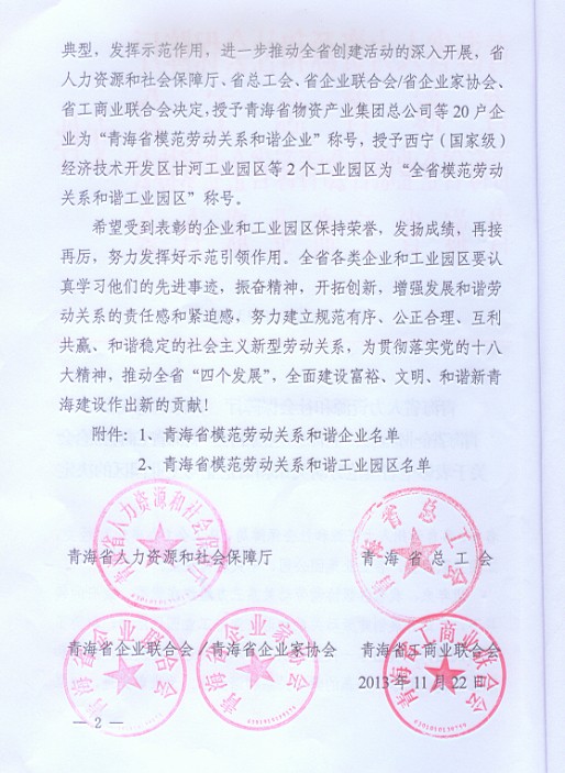 青海省物產(chǎn)集團(tuán)總公司榮獲“青海省模范勞動關(guān)系和諧企業(yè)”稱號